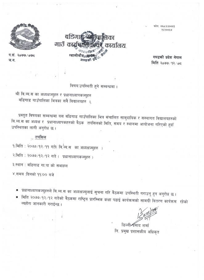 यस बडिगाड गाउँपालिकाकाे कार्यालय सहित मातहतका वडा कार्यालय, स्वस्थ्य संस्था लगायत सम्पूर्ण शाैक्षिक संघ-संस्थाहरुमा शाेक विदा दिने सम्बन्धि सूचना ।