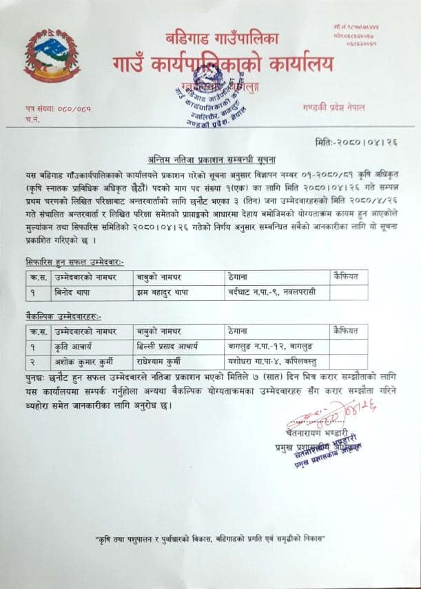 उम्मेदवार सिफारिस गरिएको सूचना (कृषि स्नातक प्राविधिक अधिकृत छैठौं)!!