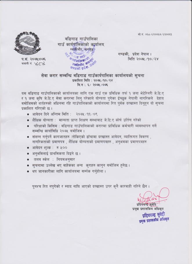 सेवा करार सम्बन्धी बडिगाड गाउँकार्यपालिका कार्यालयको सूचना