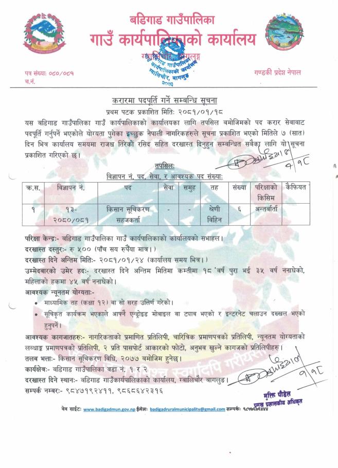 अ.न.मी. सेवा करार सम्बन्धि बडिगाड गाउँकार्यपालिका कार्यालयको सूचना