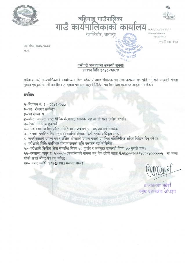 सेवा करार सम्बन्धी बडिगाड गाउँकार्यपालिका कार्यालयको सूचना