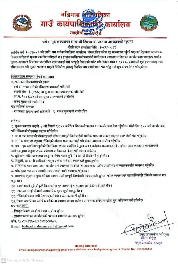 » चमेना गृह सञ्चालन सम्बन्धी शिलबन्दी प्रस्ताव आव्हानको सूचना ।