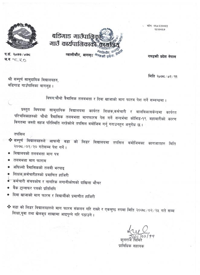चौथो त्रैमासिक तलव भत्ता र दिवा खाजाको माग फारम पेश गर्ने सम्बन्धि सूचना !!