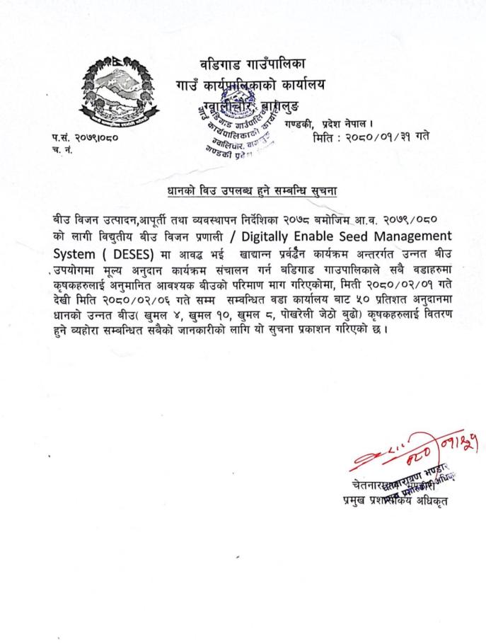धानको विउ उपलब्ध हुने सम्बन्धी सूचना ।।