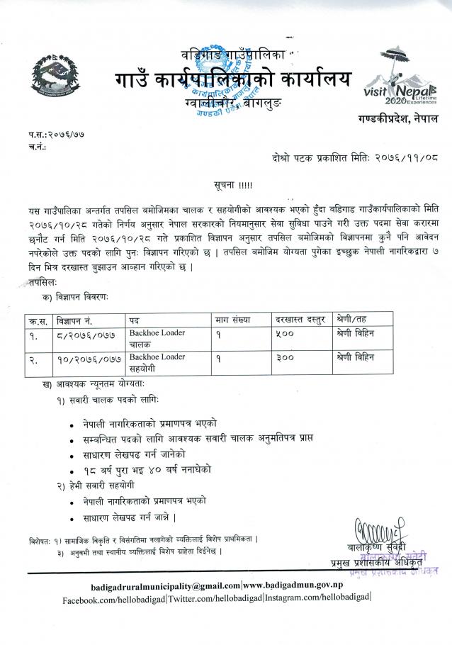 सेवा करार सम्बन्धी बडिगाड गाउँकार्यपालिका कार्यालयको सूचना