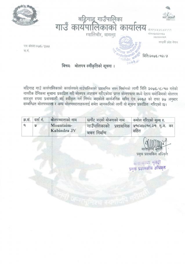 बोलपत्र स्वीकृतिको सूचना !!!!