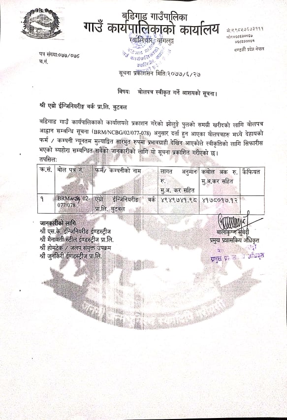 बोलपत्र स्वीकृति गर्ने आशयको सूचना !!!!