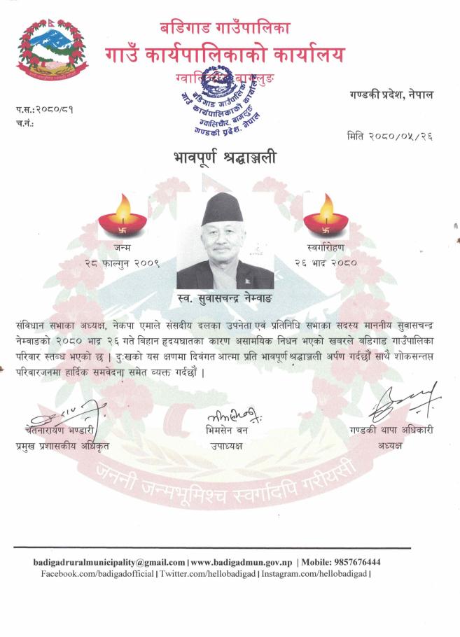 यस बडिगाड गाउँपालिकाकाे कार्यालय सहित मातहतका वडा कार्यालय, स्वस्थ्य संस्था लगायत सम्पूर्ण शाैक्षिक संघ-संस्थाहरुमा शाेक विदा दिने सम्बन्धि सूचना ।