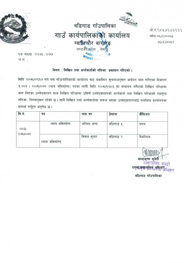 लिखित तथा अन्तर्वार्ताको नतिजा प्रकाशन गरिएको सूचना |||