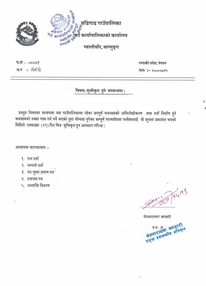 अ.न.मी. सेवा करार सम्बन्धि बडिगाड गाउँकार्यपालिका कार्यालयको सूचना