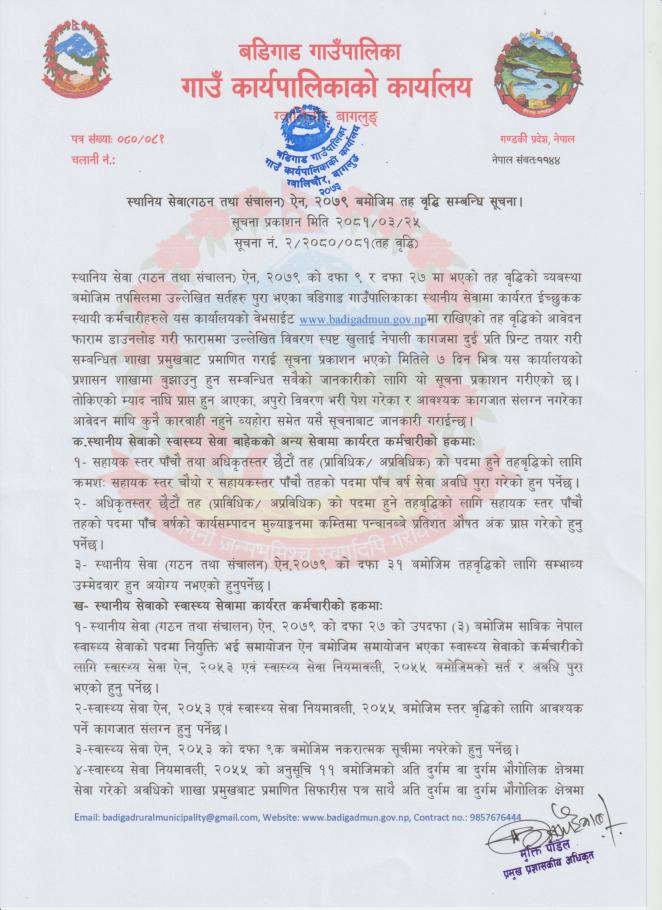» स्थानिय सेवा (गठन तथा संचालन) ऐन, २०७९ बमोजिम तह वृद्धि सम्बन्धि सूचना ।