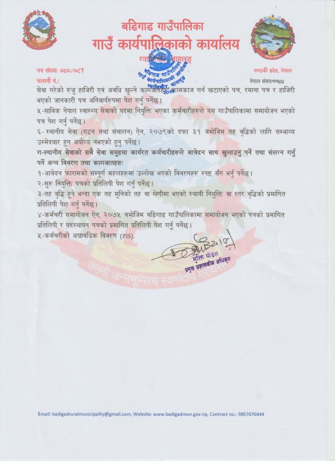 अ.न.मी. सेवा करार सम्बन्धि बडिगाड गाउँकार्यपालिका कार्यालयको सूचना
