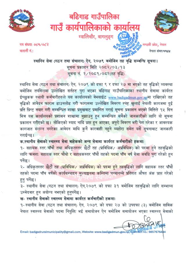 » स्थानिय सेवा (गठन तथा संचालन) ऐन, २०७९ बमोजिम तह वृद्धि सम्बन्धि सूचना ।।
