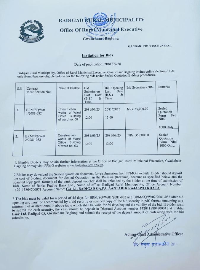 » Invitation for bids (2081/09/28)(Ward office 3 & 8 Building)