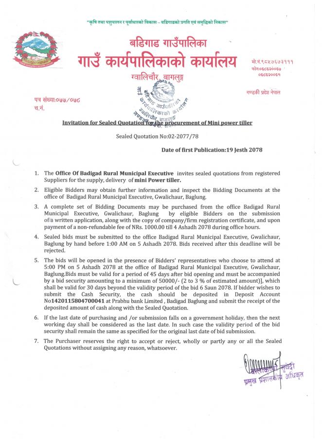 » Invitation for sealed quatation for the procurement of Mini Power tiller(02-2077/78))