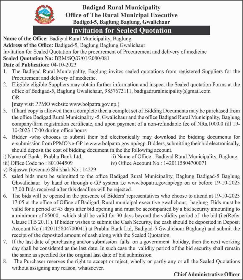 कृषी तथा पशुसेवा विकास कार्यक्रम सँचालनको लागी बडिगाड गाउँपालिकाले उपलब्ध गराउने शसर्त अनुदानको लागी प्रस्ताव आब्हान गरिएको सुचना