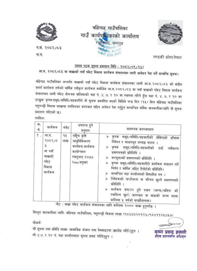 कृषी तथा पशुसेवा विकास कार्यक्रम सँचालनको लागी बडिगाड गाउँपालिकाले उपलब्ध गराउने शसर्त अनुदानको लागी प्रस्ताव आब्हान गरिएको सुचना