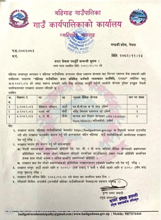 अ.न.मी. सेवा करार सम्बन्धि बडिगाड गाउँकार्यपालिका कार्यालयको सूचना
