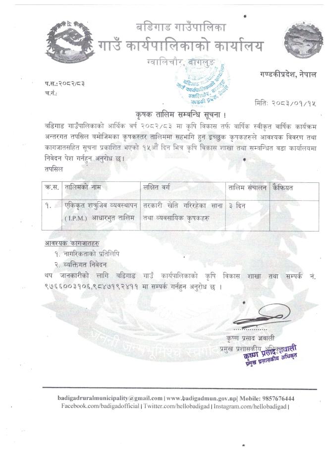 कृषी तथा पशुसेवा विकास कार्यक्रम सँचालनको लागी बडिगाड गाउँपालिकाले उपलब्ध गराउने शसर्त अनुदानको लागी प्रस्ताव आब्हान गरिएको सुचना