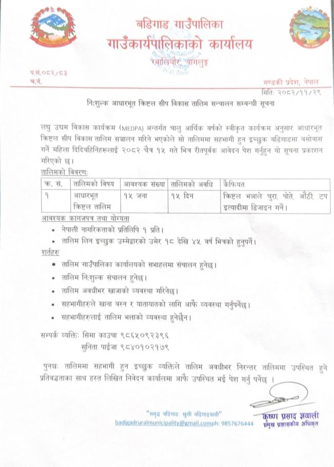 » निःशुल्क आधारभूत क्रिष्टल सीप विकास तालिम सन्चालन सम्बन्धी सूचना ।