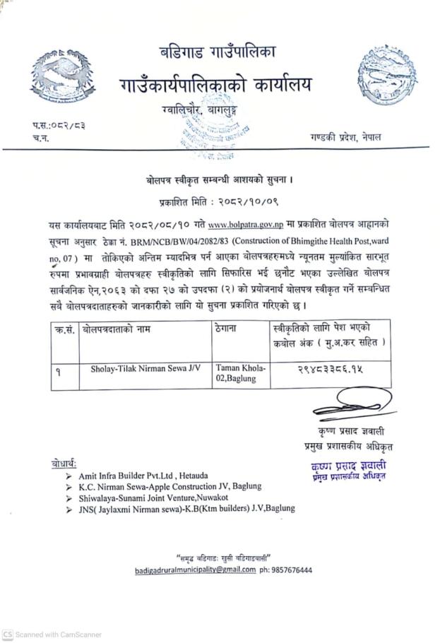 बोलपत्र स्वीकृतिको सूचना !!!!