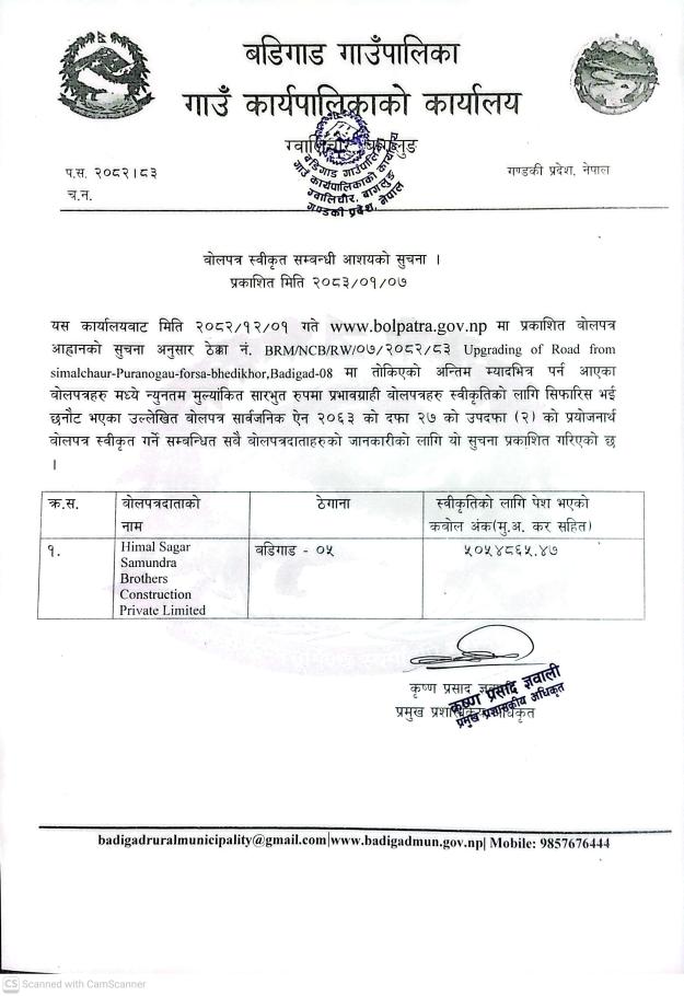 बोलपत्र स्वीकृतिको सूचना !!!!