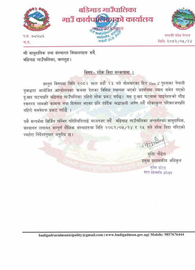 यस बडिगाड गाउँपालिकाकाे कार्यालय सहित मातहतका वडा कार्यालय, स्वस्थ्य संस्था लगायत सम्पूर्ण शाैक्षिक संघ-संस्थाहरुमा शाेक विदा दिने सम्बन्धि सूचना ।