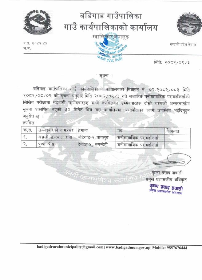 अ.न.मी. सेवा करार सम्बन्धि बडिगाड गाउँकार्यपालिका कार्यालयको सूचना