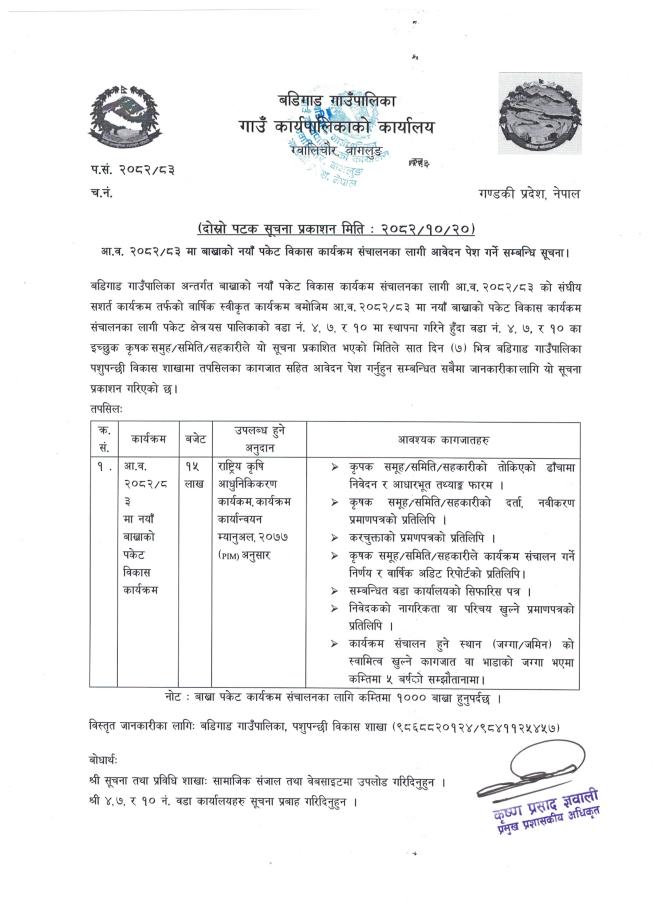 कृषी तथा पशुसेवा विकास कार्यक्रम सँचालनको लागी बडिगाड गाउँपालिकाले उपलब्ध गराउने शसर्त अनुदानको लागी प्रस्ताव आब्हान गरिएको सुचना