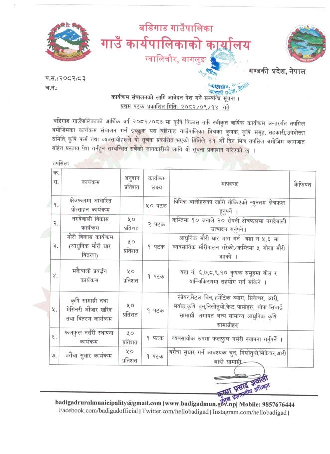 कृषी तथा पशुसेवा विकास कार्यक्रम सँचालनको लागी बडिगाड गाउँपालिकाले उपलब्ध गराउने शसर्त अनुदानको लागी प्रस्ताव आब्हान गरिएको सुचना