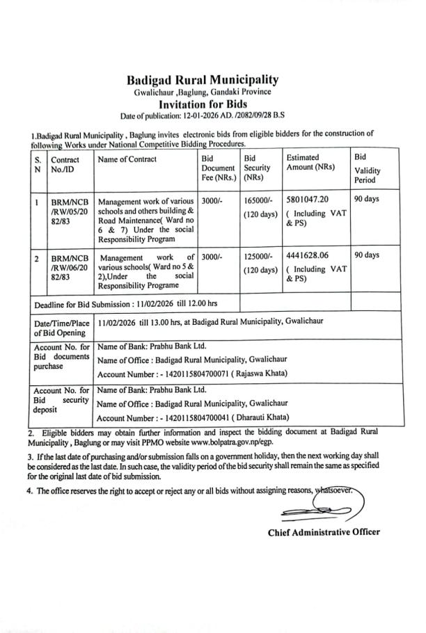सेवा करार सम्बन्धी बडिगाड गाउँकार्यपालिका कार्यालयको सूचना