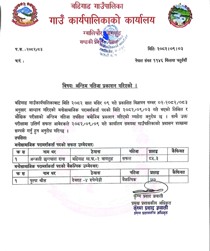 मनोसामाजिक परार्मशकर्ता पदको अन्तिम नतिजा प्रकाशन गरिएको सूचना ।